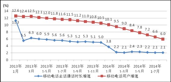圖5. 2013-2014年各月移動(dòng)話音業(yè)務(wù)量和移動(dòng)用戶同比增長(zhǎng)比較