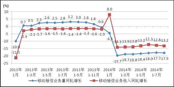 圖6. 2013-2014年各月移動(dòng)短信業(yè)務(wù)量和移動(dòng)短信收入同比增長(zhǎng)情況
