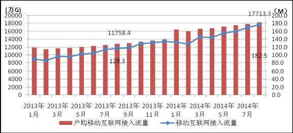 圖7. 2013-2014年各月移動(dòng)互聯(lián)網(wǎng)接入流量和戶均流量比較