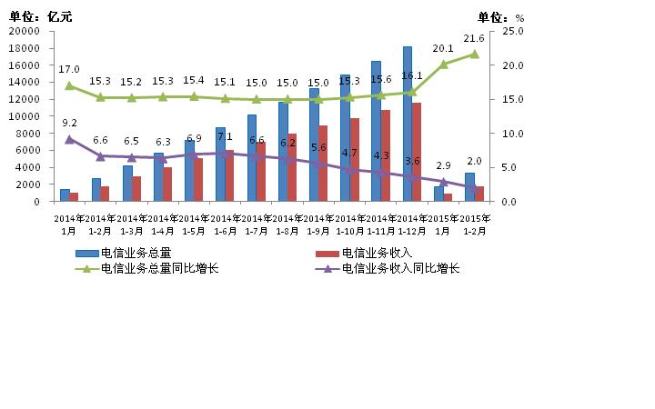 1-2月,電信業(yè)務(wù)總量完成3289.2億元,同比增長21.6%,比1月提高1.5個百分點,保持加速增長趨勢。電信業(yè)務(wù)收入完成1750.7億元,按可比口徑測算同比增長2%,比1月同比增速回落0.9個百分點,自2014年6月連續(xù)8個月增速下滑,量收差繼續(xù)拉大。