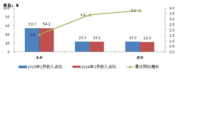 圖10 2015年2月東、中、西部電信主營業(yè)務(wù)收入同期比較