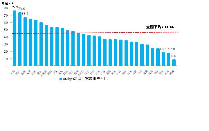 2月,東、中、西部地區(qū)8Mbps及以上寬帶用戶分別比上年末凈增293.9、272.1、224.5萬戶,東部地區(qū)的凈增用戶均超過中西部地區(qū),但相差不大,可見各省在固定寬帶提速方面取得了良好效果。東中西部地區(qū)8Mbps及以上寬帶用戶占比情況相差較大,西部地區(qū)8Mbps及以上寬帶用戶占比最高,達49%,中部地區(qū)最低,僅為35%。。各省間8Mbps及以上寬帶用戶占比差異依然較大,占比高于50%的省份接近三分之一,其中上海和四川居全國前兩位,且為全國僅有的超過70%的省份。占比低于20%的分別為海南、陜西和西藏,其中西藏占比全國最低,僅為8.6%。
