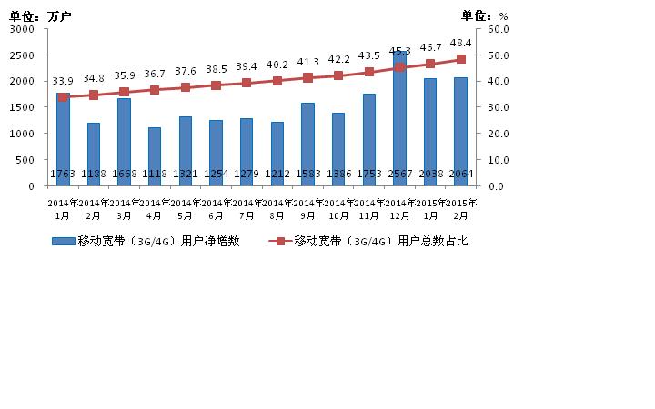 圖2.2014-2015年2月移動寬帶用戶當(dāng)月凈增數(shù)和總數(shù)占比情況