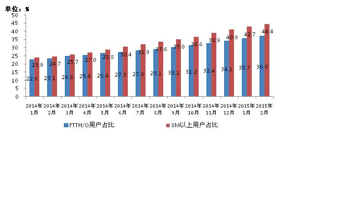 圖3 2014-2015年2月光纖接入FTTH/O和8Mbps及以上寬帶用戶占比情況
