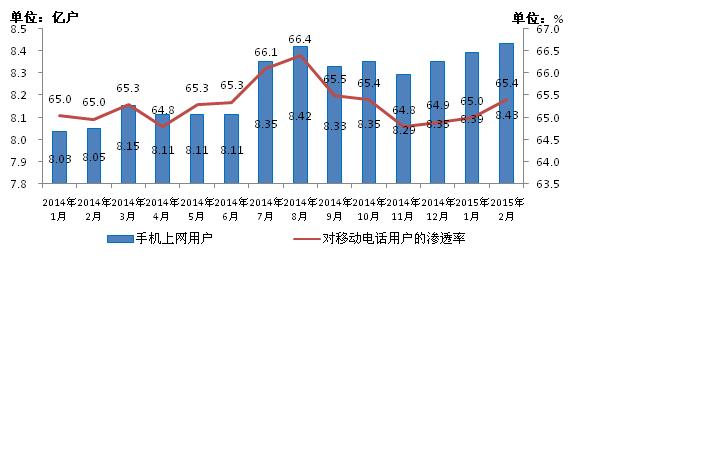 圖4 2014-2015年2月手機上網(wǎng)用戶和對移動電話用戶滲透率情況