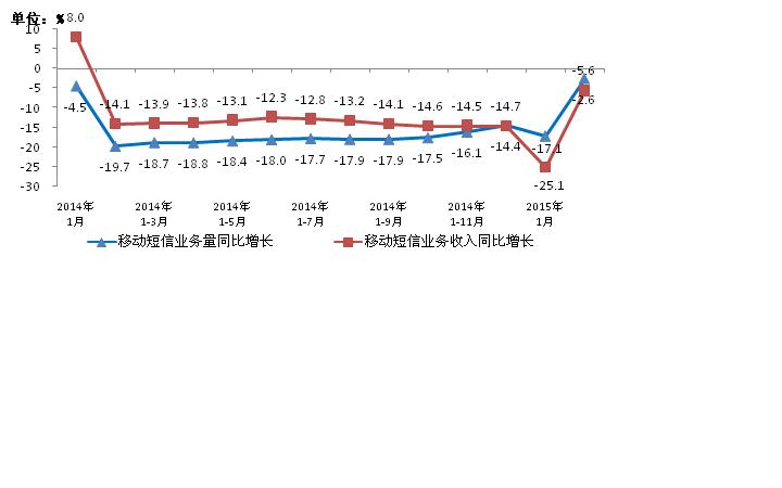 圖6. 2014-2015年2月移動短信業(yè)務(wù)量和移動短信收入同比增長情況