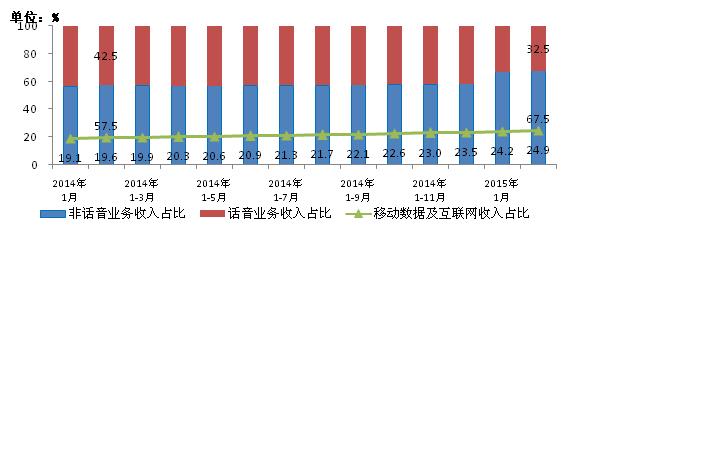 圖9 2014年-2105年2月話音、非話音、移動數(shù)據(jù)及互聯(lián)網(wǎng)收入占比情況