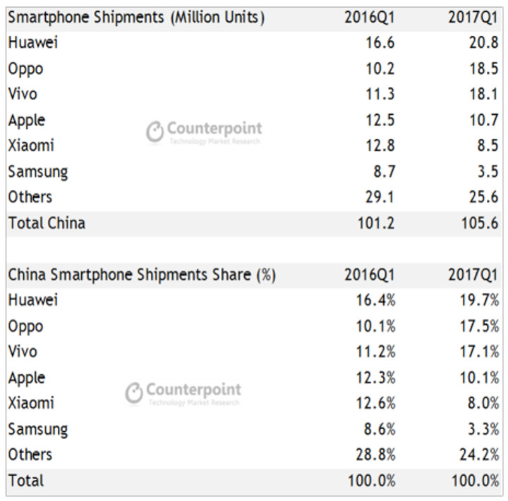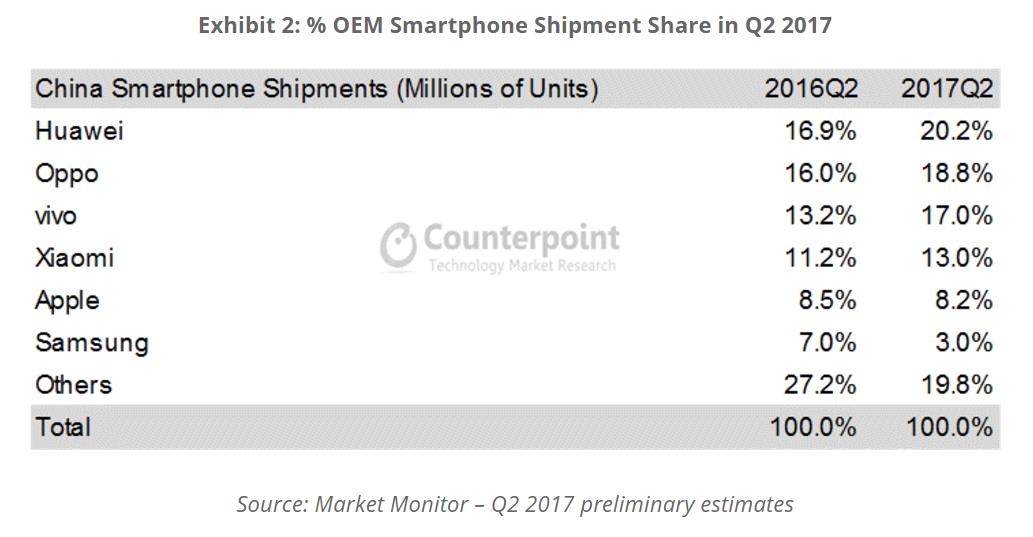 Counterpoint最新發(fā)布的調(diào)研報告稱,2017年第二季度,中國手機市場的出貨量同比增長了3%。