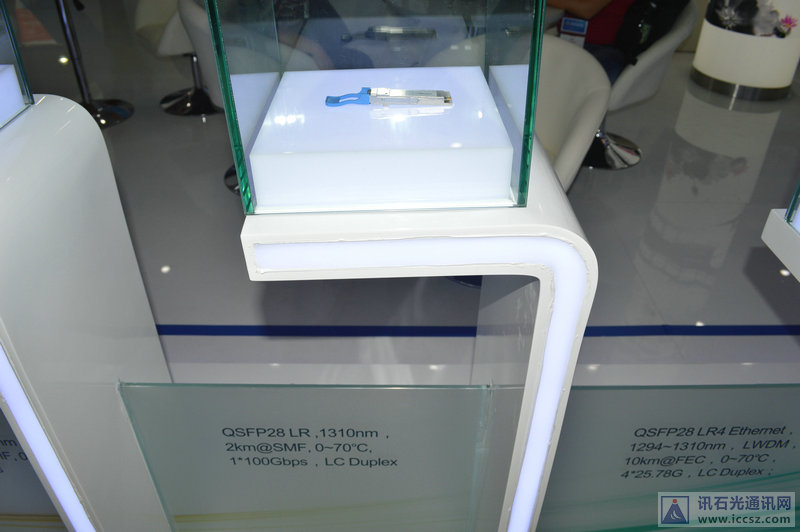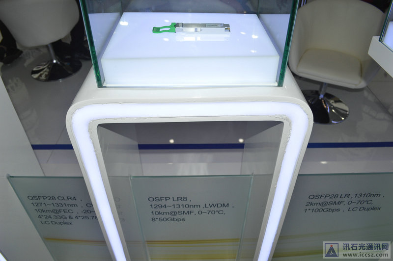 產(chǎn)品展示方面,旭創(chuàng)在CIOE上展示多款100G光模塊,如100G QSFP28 SR4/PSM IR4/LR Ethernet、單通道100G QSFP28 LR樣品,更有備受關(guān)注的400G OSFP LR8光模塊。