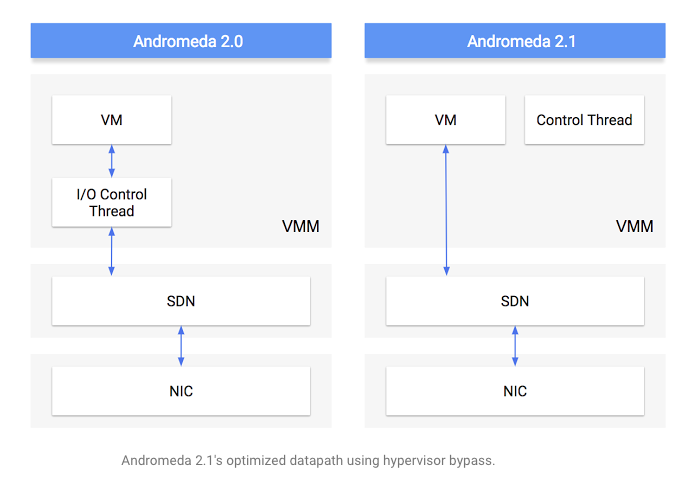 Andromeda 2.1延遲的改進來自于虛擬機管理程序旁路,其基于virtio,即網(wǎng)絡和磁盤設備驅(qū)動程序的Linux半虛擬化標準。Google Cloud軟件工程師Jake Adriaens今天在一篇博客中寫道:“Andromeda 2.1增強功能使計算引擎客機虛擬機和Andromeda軟件交換機能夠通過共享內(nèi)存網(wǎng)絡隊列進行通信,從而完全繞過虛擬機管理程序,實現(xiàn)對性能敏感的數(shù)據(jù)包操作。”