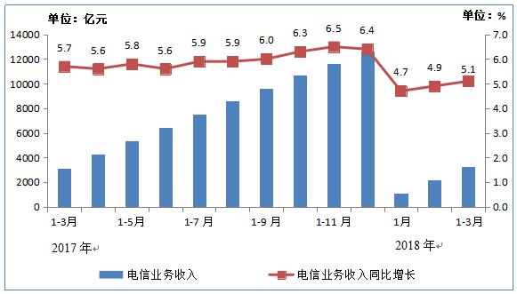 電信業(yè)務(wù)收入保持穩(wěn)步增長(zhǎng)。2018年1-3月,電信業(yè)務(wù)總量①完成10999億元,同比增長(zhǎng)121.9%。電信業(yè)務(wù)收入完成3288億元,同比增長(zhǎng)5.1%。