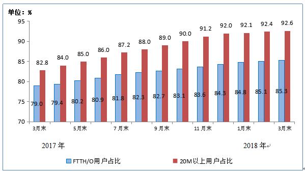 圖5 2017-2018年3月光纖接入(FTTH/O)和20Mbps及以上固定寬帶接入用戶占比情況