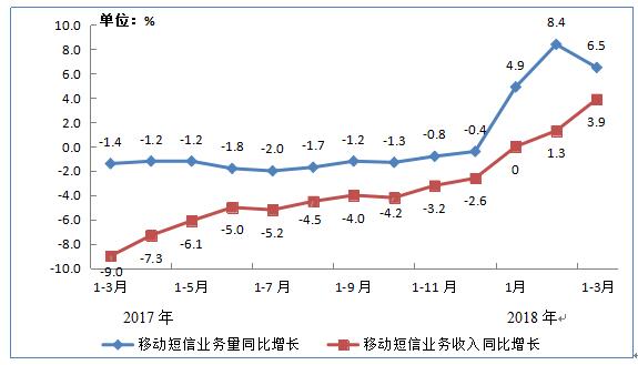 圖8 2018年1-3月移動(dòng)短信業(yè)務(wù)量和收入同比增長(zhǎng)情況