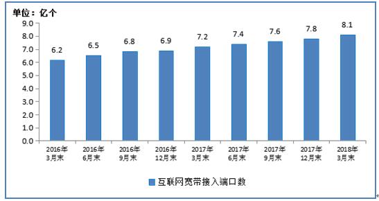 圖10 2016-2018年3月互聯(lián)網(wǎng)寬帶接入端口數(shù)發(fā)展情況