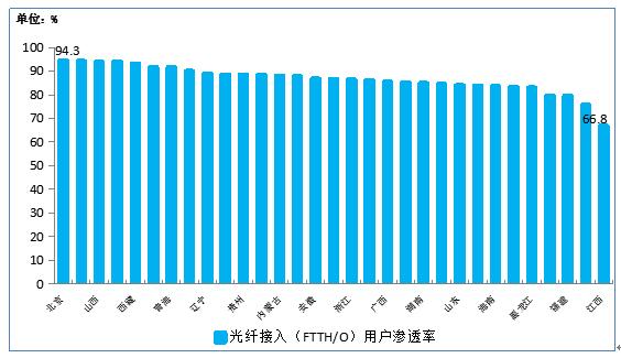 西部光纖接入(FTTH/O)滲透率保持領(lǐng)先。3月末,東、中、西部地區(qū)光纖接入(FTTH/O)用戶分別達(dá)到15056萬(wàn)戶、8213萬(wàn)戶和7576萬(wàn)戶,用戶滲透率西部地區(qū)領(lǐng)先,達(dá)到87.8%,東部、中部地區(qū)分別為84.1%和85.3%。各省光纖接入(FTTH/O)用戶滲透率差異呈縮小態(tài)勢(shì),北京、寧夏、山西、河北、西藏、河南、青海、新疆分別居全國(guó)前八位,占比均超過(guò)90%。