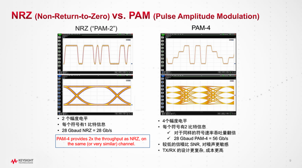 在《100G/400G 數(shù)據(jù)中心解決方案》的演講中,朱老師分享了高速率數(shù)據(jù)中心解決方案的市場趨勢及100G/400G甚至更高速率的行業(yè)標準的發(fā)展情況,其中100G標準在2015年前基本完成,IEEE 802.3bs 200/400GBaseE 技術標準在2018年春季發(fā)表。據(jù)悉,是德科技基于PAM4光模塊整體測試方案包括PAM4信號產(chǎn)生、光/電PAM4信號的測試及系統(tǒng)誤碼率測試。朱老師闡述PAM4信號產(chǎn)生和測試面臨的挑戰(zhàn),將NRZ(“PAM-2”)信號與PAM-4信號進行對比,PAM-4比NRZ的噪聲容線更低,更容易受噪聲影響,同時其對線性度的要求更高!