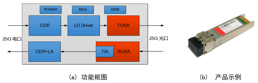 25Gb/s雙纖雙向灰光模塊功能框圖及產(chǎn)品示例如圖3所示。IEEE 802.3cc已完成25GbE單模光纖接口規(guī)范,CCSA已啟動國內行業(yè)標準化制定工作,預計2019年完成報批。