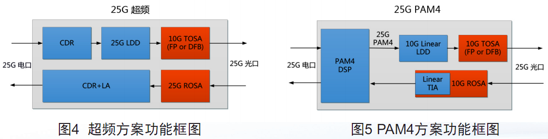 光模塊可采用25G和10G兩種波特率的激光器芯片來實現(xiàn)。25G波特率工業(yè)級激光器芯片可靠性要求與量產(chǎn)工藝要求較高,市場供應渠道有限。10G波特率工業(yè)級激光器芯片能充分利用成熟的供應鏈,可有效降低光模塊成本,目前業(yè)界主要有超頻、PAM4高階調制兩種實現(xiàn)方案,功能框圖分別如圖4和圖5所示。