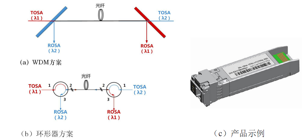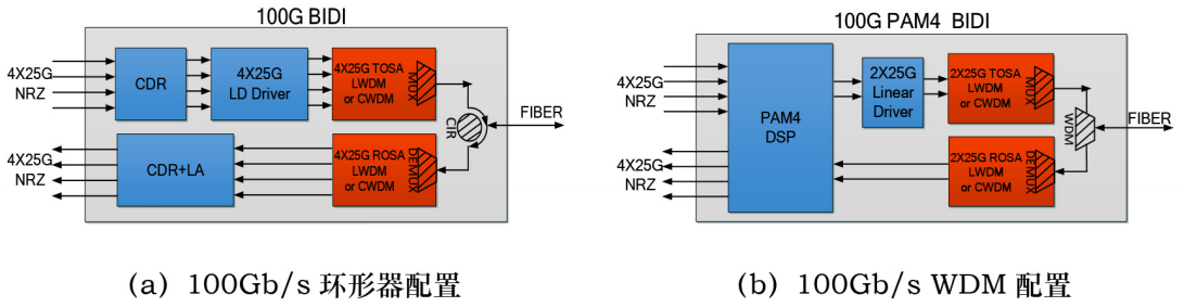 100/200Gb/s BiDi 10km光模塊的技術方案正處于研究階段,典型實現(xiàn)方式包括環(huán)形器和WDM兩種,功能框圖如圖8所示。