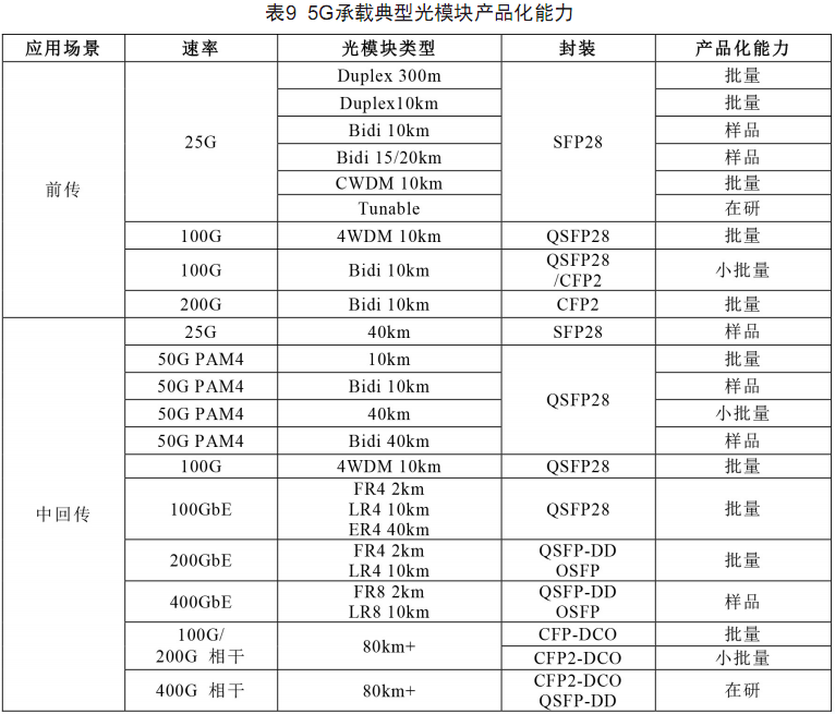 國(guó)內(nèi)外光模塊廠商圍繞5G應(yīng)用積極開展5G承載光模塊研發(fā),目前的產(chǎn)品化能力如表9所示。5G前傳25Gb/s光模塊方面,波長(zhǎng)可調(diào)諧光模塊處于在研階段,BiDi光模塊處于樣品階段,其他類型的光模塊均已成熟。前傳100Gb/s BiDi光模塊的應(yīng)用規(guī)模較小,200Gb/s BiDi光模塊和100Gb/s 4WDM光模塊已經(jīng)成熟。5G中回傳50Gb/s PAM4 BiDi 40km光模塊、400Gb/s直調(diào)和相干光模塊均處于在研階段,其他類型光模塊已基本成熟。