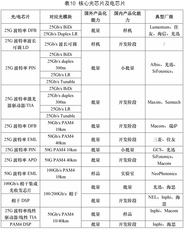 5G典型光模塊所使用的核心光芯片及電芯片產(chǎn)業(yè)化能力如表10所示,領(lǐng)先國(guó)家均已基本成熟,國(guó)內(nèi)在整體上尚處于研發(fā)階段。目前,商業(yè)級(jí)/工業(yè)級(jí)25G波特率的DFB、EML、50G波特率的EML激光器芯片、窄線寬波長(zhǎng)可調(diào)激光器芯片、100Gb/s相干集成光收發(fā)芯片、25/50G波特率的激光器(調(diào)制器)驅(qū)動(dòng)/TIA跨阻放大器、PAM4和相干 DSP等IC芯片主要由國(guó)外廠商提供,國(guó)內(nèi)產(chǎn)業(yè)化能力與國(guó)外差距較大。