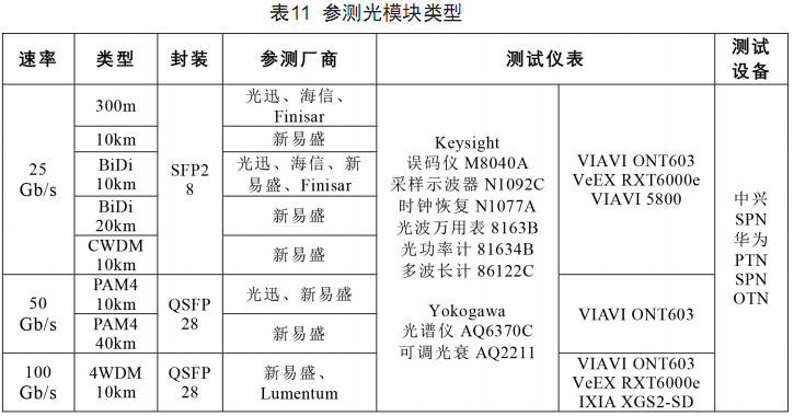 為評(píng)估5G承載光模塊的發(fā)展水平和應(yīng)用能力,促進(jìn)產(chǎn)業(yè)鏈相關(guān)方的協(xié)同、合作與交流,5G承載工作組組織開展了首次基于多廠家多模塊類型的5G承載光模塊測(cè)評(píng)工作。光模塊商光迅、海信、新易盛、Finisar、Lumentum參加了測(cè)試,運(yùn)營(yíng)商中國(guó)移動(dòng)、中國(guó)電信、中國(guó)聯(lián)通,系統(tǒng)設(shè)備商華為、中興,儀表商Keysight、VIAVI、VeEX對(duì)測(cè)試提供了大力支持。參測(cè)光模塊包括 25Gb/s Duplex 300m、25Gb/s Duplex 10km、25Gb/s BiDi 10km、25Gb/s BiDi 20km、25Gb/s CWDM 10km、50Gb/s PAM4 10km、50Gb/s PAM4 40km、100Gb/s 4WDM 10km 8種類型,如表11所示。