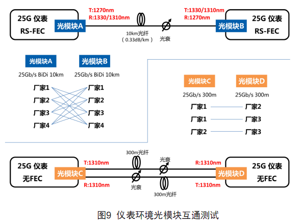 25Gb/s BiDi 10km光模塊有1330nm/1270nm和1310nm/1270nm兩種波長(zhǎng)方案,如圖9所示配置,在儀表開啟RS-FEC模式下,1330nm/1270nm相同波長(zhǎng)方案的光模塊實(shí)現(xiàn)10km光纖+9~11dB衰減的異廠家光模塊互通傳輸;1330nm/1270nm和1310nm/1270nm不同波長(zhǎng)方案的光模塊實(shí)現(xiàn)10km光纖+5.5~8.5dB衰減的異廠家光模塊互通傳輸。25Gb/s 300m光模塊為1310nm波段,在儀表關(guān)閉FEC模式下實(shí)現(xiàn)10km光纖+10~15dB衰減的異廠家光模塊互通傳輸。