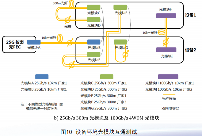 如圖10所示配置,在設(shè)備環(huán)境關(guān)閉FEC模式下,25Gb/s BiDi 10km光模塊(1330nm/1270nm方案)實(shí)現(xiàn)10km光纖+3dB衰減多廠家互通傳輸;25Gb/s 300m光模塊實(shí)現(xiàn)300m光纖+3dB衰減多廠家互通傳輸;100Gb/s 4WDM 10km光模塊實(shí)現(xiàn)10km光纖+3dB衰減異廠家互通傳輸。