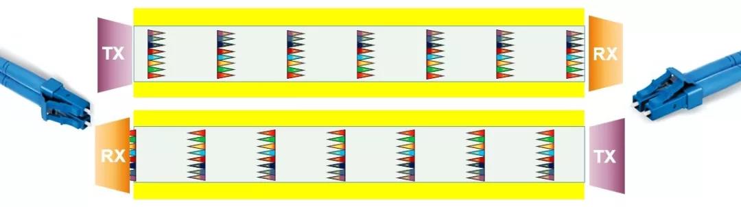 采用4路并行傳輸技術(shù)和波分復(fù)用技術(shù),每個(gè)通道傳輸雙向50G共100G。接口可以采用普通12芯MPO,兩側(cè)8芯可以用于傳輸,多模光纖可以采用OM3,OM4及OM5,支持的長度分別為70米,100米,150米。這種應(yīng)用特點(diǎn):接口與40G/100G相同可以向下兼容,但由于采用波分復(fù)用技術(shù),收發(fā)器成本相對單波長的收發(fā)器成本更高。