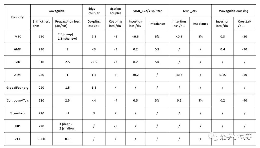 1)目前主流的硅光芯片采用220nm的SOI, 只有Leti采用310nm厚的Si, VTT采用3um的厚硅工藝。
