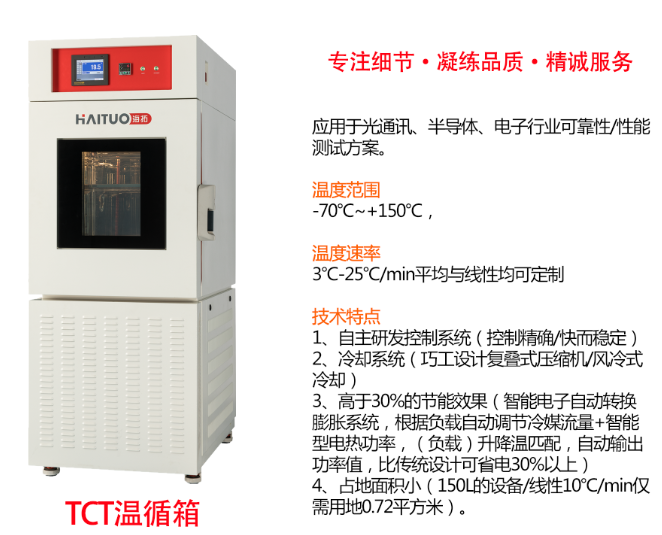 據(jù)海拓介紹,新產(chǎn)品桌上型TEC高低溫沖擊箱廣泛應用于光模塊、芯片、傳感器等微電子研發(fā)、生產(chǎn)所用的高溫、常溫、低溫等三溫可靠性及性能測試最佳解決方案。被測試樣品在瞬間經(jīng)極高溫及極低溫的連續(xù)環(huán)境下忍受的反復抵抗程度,得以在最短時間內(nèi)檢測樣品因熱脹冷縮所引起的化學變化和物理傷害,進而確認產(chǎn)品品質(zhì)。新產(chǎn)品特點,其采用國內(nèi)領先技術,自主研發(fā)精準控制系統(tǒng),在更低能耗下高效地提升生產(chǎn)效率。