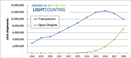 圖:前五大云計(jì)算公司對(duì)以太網(wǎng)收發(fā)器和Opto-chiplet的需求走勢(shì)(速率包括100GbE及更高,傳輸距離僅限100米和500米)
