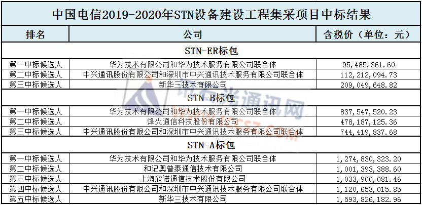 ICCSZ訊(編輯:Aiur) 1月16日,中國電信發(fā)布2019-2020年STN設(shè)備建設(shè)工程集采項目中標(biāo)結(jié)果,中標(biāo)候選人是華為、中興通訊、新華三、烽火通信、和記奧普和上海欣諾通信,具體報價和排名如下: