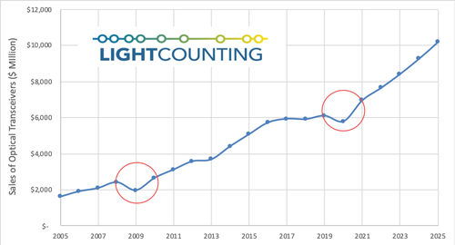 ICCSZ訊(編譯:Nina)由于COVID-19的蔓延,LightCounting(LC)在最新預(yù)測(cè)里表示對(duì)2020年收發(fā)器市場(chǎng)的期望并不高。雖然光通信行業(yè)不會(huì)像旅游業(yè)和酒店業(yè)那樣受到病毒影響,但沒(méi)有哪個(gè)行業(yè)能幸免于全球經(jīng)濟(jì)衰退。