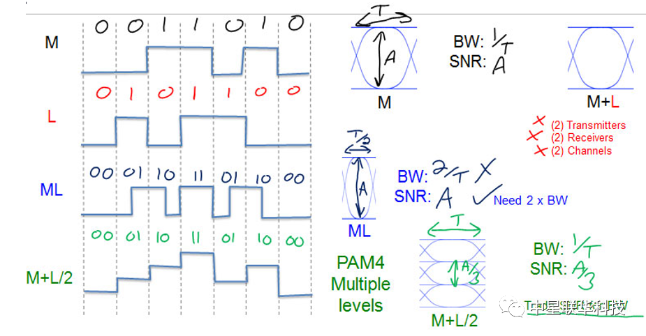 由于龐大的數(shù)據(jù)量導(dǎo)致鏈路容限接近飽和,數(shù)據(jù)中心和承載網(wǎng)絡(luò)都具有超低時延的要求,這導(dǎo)致丟失數(shù)據(jù)無法再次重新傳遞,為了節(jié)省成本采用多電平傳輸?shù)姆绞健? Pulse Amplitude Modulation(簡稱PAM4)作為新出現(xiàn)的高速串行總線編碼模式,在幾乎所有的超過200G、400G的標(biāo)準(zhǔn)中都存在。由于在同等速率的情況下帶寬的要求是NRZ的一半,對于絕大多數(shù)的高速電纜,背板以及連接器而言,通過PAM4可以在速率增倍的情況下具備同樣的奈奎斯特頻率。