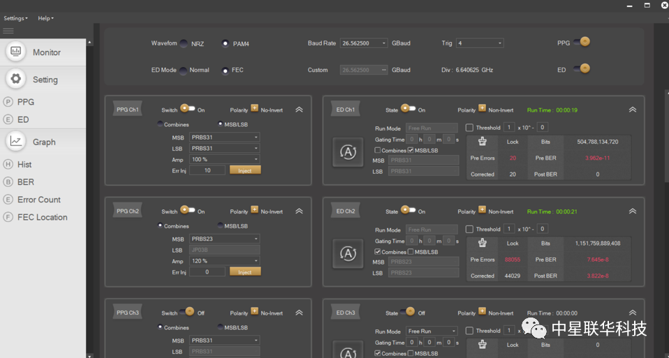 在軟件界面上可以快速設(shè)置FEC模式,顯示糾錯前的誤碼個數(shù)和誤碼率、糾錯后的誤碼個數(shù)和誤碼率,糾正的誤碼個數(shù)。具有接收端自動檢測功能,可以自動匹配支持的碼型并顯示,可以自動糾正接收端極性,避免了使用過程中因錯誤鏈接帶來的復(fù)雜操作。