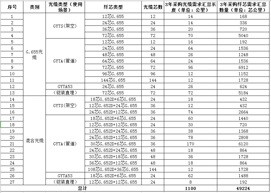 根據(jù)此前招標(biāo)公布,該項(xiàng)目需采購(gòu)G.655光纜及混合光纜,合計(jì)27個(gè)類型共1100皮長(zhǎng)公里,詳細(xì)內(nèi)容及數(shù)量明細(xì)見(jiàn)下圖: