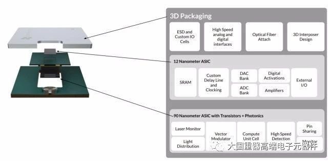 上面是一個12nm的ASIC,具有內(nèi)存和控制功能,下面是作為計算引擎的90nm硅光電器件