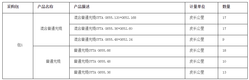 本次采購(gòu)混合光纜,采購(gòu)內(nèi)容及數(shù)量如下,具體需求詳見技術(shù)規(guī)范書。