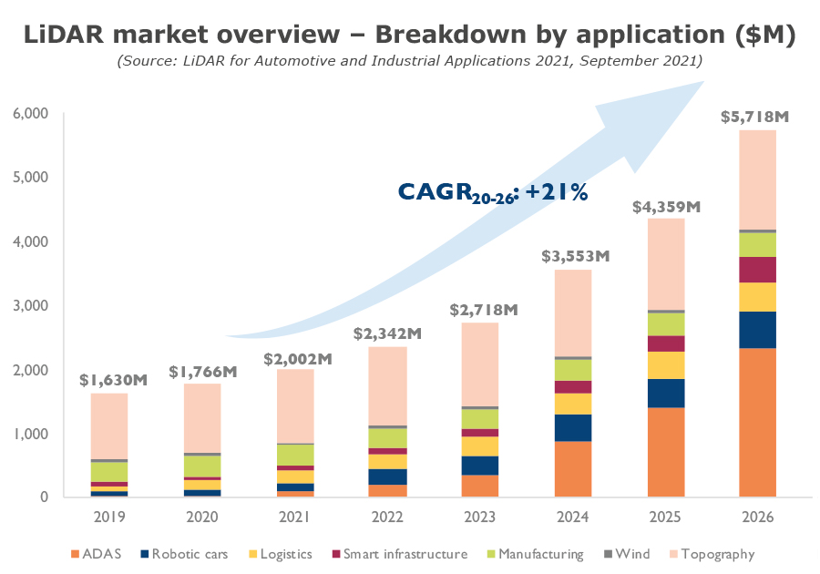 隨著汽車自動駕駛、測風測距、光學測繪、安防和智慧城市等領(lǐng)域快速發(fā)展,激光雷達(LiDAR)技術(shù)趨于成熟,制造成本不斷下探,應用價值快速上升。在家庭應用領(lǐng)域,激光雷達極大地提升了掃地機器人的覆蓋精度,而在億萬量級的全球汽車市場,豐田、奔馳、寶馬、大眾、吉利、比亞迪、蔚來、理想、小鵬等眾多汽車整機廠商紛紛開始在最新車型上部署激光雷達或進行相關(guān)的投資布局,使商用激光雷達有望在2022年迎來量產(chǎn)元年。YOLE預測,到2022年底,汽車激光雷達市場將達4.21億美元,到2026年底將增長至28.95億美元。