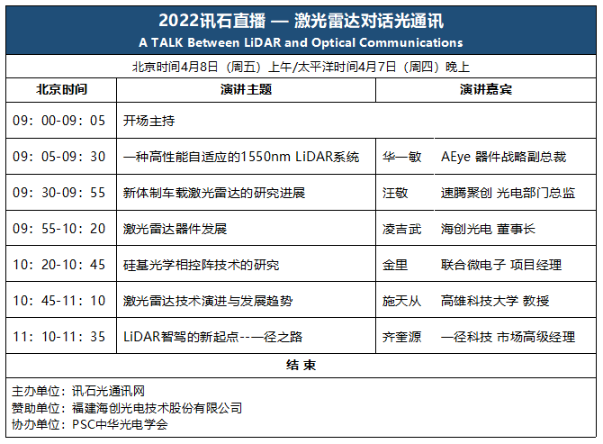 ICC訊 2022訊石直播 — “激光雷達對話光通訊”線上會議將于北京時間4月8日舉辦,歡迎激光雷達(LiDAR)、光通訊、光傳感、光電子和芯片等行業(yè)領(lǐng)域的企業(yè)、高校人士參與,共同探索激光雷達帶給光通訊發(fā)展機遇和協(xié)同發(fā)展之契機。本次會議嘉賓將邀請來自激光雷達和光通訊皆有豐富經(jīng)驗的技術(shù)專家和企業(yè)領(lǐng)袖,闡述激光雷達的市場機遇和技術(shù)演進,以及光通訊如何發(fā)揮規(guī)模制造和研發(fā)創(chuàng)新能力,助力激光雷達實現(xiàn)更具性價比的商業(yè)部署。
