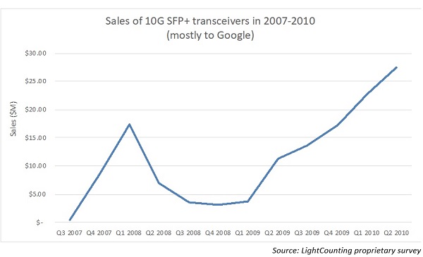 如下圖所示,2008-2009年的經(jīng)濟衰退對云公司的光收發(fā)器銷售造成了重大影響。當(dāng)時,谷歌是唯一一家部署光學(xué)系統(tǒng)的云公司。谷歌的光學(xué)項目從2007年底開始,到2008年第一季度時的峰值僅為1500萬美元。因此雖然該項目在經(jīng)濟衰退的第一個跡象出現(xiàn)時就被擱置了,但對整體市場的影響很小。相比之下,2021年,谷歌在光學(xué)設(shè)備上的支出接近10億美元,亞馬遜的花費超過了這個數(shù)字。如果云計算公司現(xiàn)在暫停光學(xué)系統(tǒng)部署,80億美元的光收發(fā)器市場將會崩潰。