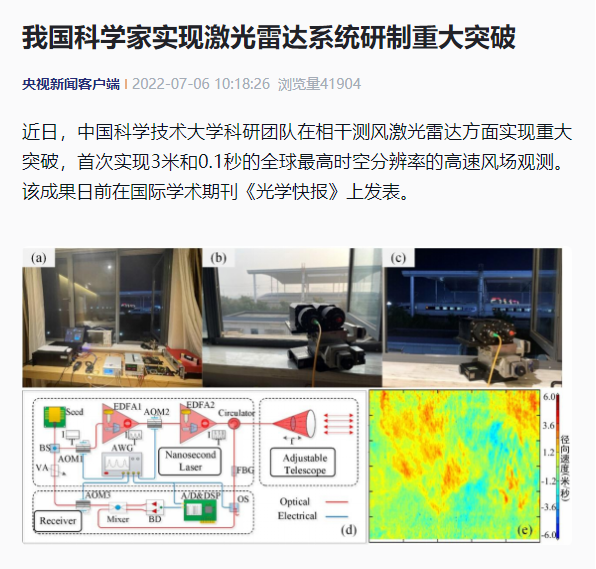 ICC訊 7 月 6 日消息,據(jù)央視新聞報(bào)道,近日,中國(guó)科學(xué)技術(shù)大學(xué)科研團(tuán)隊(duì)在相干測(cè)風(fēng)激光雷達(dá)方面實(shí)現(xiàn)重大突破,首次實(shí)現(xiàn) 3 米和 0.1 秒的全球最高時(shí)空分辨率的高速風(fēng)場(chǎng)觀測(cè)。該成果日前在國(guó)際學(xué)術(shù)期刊《光學(xué)快報(bào)》上發(fā)表。