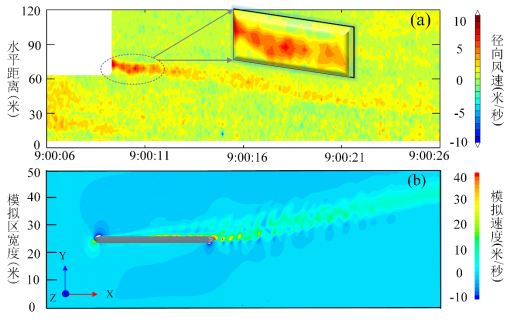 ▲ 圖 2 高鐵尾流風(fēng)場(chǎng)結(jié)構(gòu)觀測(cè)及模擬結(jié)果:(a) 雷達(dá)觀測(cè)的 0.1 秒分辨率尾流中風(fēng)場(chǎng)結(jié)構(gòu)圖;(b) 基于 CCM + 模擬的 300km / h 運(yùn)行列車的尾流風(fēng)場(chǎng)結(jié)構(gòu)。