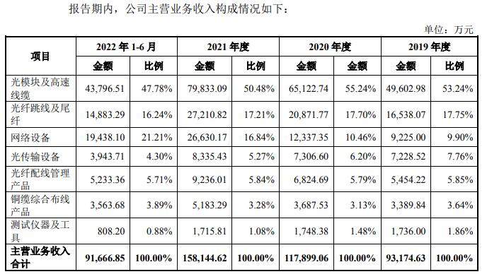 飛速創(chuàng)新已開發(fā)超過7萬個SKU 的核心設(shè)備及通用配件,主要產(chǎn)品包括光模塊及高速線纜、光纖跳線及尾纖、網(wǎng)絡(luò)設(shè)備、光傳輸設(shè)備、光纖配線管理產(chǎn)品、銅纜綜合布線產(chǎn)品、測試儀器及工具。光模塊產(chǎn)品主要分為100/200/400/800G光模塊系列、25/40/50G光模塊系列、10/16/32G光模塊系列和100M/1G/2G/2.5G/4G光模塊系列。其中光模塊及高速線纜的營收占比最大,報(bào)告期內(nèi)營收占比分別為53.24%、55.24%、50.48%和47.78%。