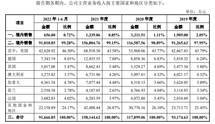 飛速創(chuàng)新2019 年度、2020 年度、2021 年度和 2022 年 1-6 月營業(yè)收入分別為93,174.63萬元、117,956.42 萬元、158,202.67萬元和91,677.16萬元。飛速創(chuàng)新的收入主要來自境外,公司境外業(yè)務(wù)覆蓋全球多個國家和地區(qū)。2019-2022年上半年,公司境外銷售占飛速創(chuàng)新主營業(yè)務(wù)收入的比例分別為97.95%、98.89%、99.15%和99.28%。其中,美國為主要收入來源,銷售額占該公司主營業(yè)務(wù)收入的比重分別為45.79%、45.77%、43.58%和46.50%。