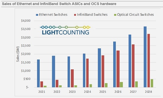 ICC訊(編譯:Nina)對人工智能應(yīng)用的新關(guān)注推動了英偉達系統(tǒng)在2023年的銷售。LightCounting估計,與2022年相比,他們的InfiniBand Switch ASIC銷售將在2023年增長近兩倍。這種強勁的增長將持續(xù)到2024年,然后在2025-2028年放緩2023-2028年的年復(fù)合增長率(CAGR)為24%。