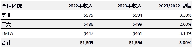 表:各區(qū)域電信服務(wù)收入及同比增長(US$B)
