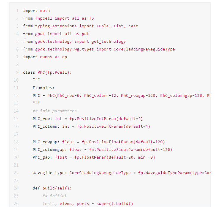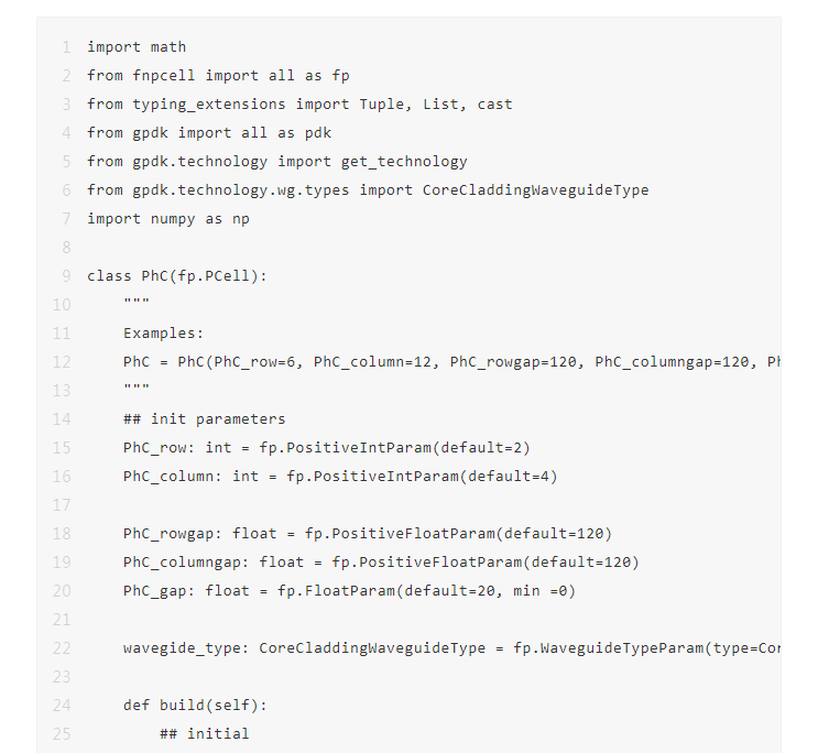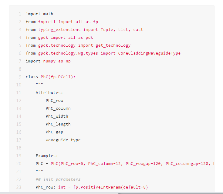 光子晶體為周期結(jié)構(gòu),基本單元也從傳統(tǒng)的單一規(guī)則結(jié)構(gòu)演變成多個基本結(jié)構(gòu)組合的結(jié)構(gòu)到?jīng)]有規(guī)律的拓撲結(jié)構(gòu)。教程提供的代碼從底層出發(fā),支持用戶自定義周期結(jié)構(gòu),在用戶定義的周期結(jié)構(gòu)的基礎(chǔ)上通過幾個簡單參數(shù)即可實現(xiàn)任意光子晶體鏈路的搭建。