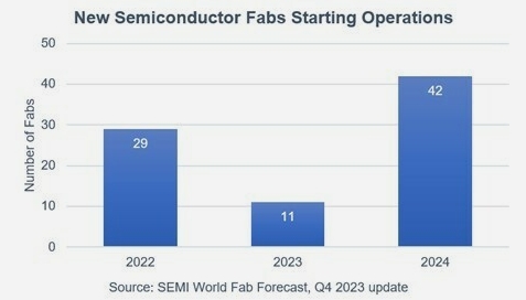 《World Fab Forecast》報告顯示,從2022年到2024年,全球半導(dǎo)體行業(yè)計劃開始運(yùn)營82個新的晶圓廠,其中包括2023年的11個項(xiàng)目和2024年的42個項(xiàng)目,晶圓尺寸從300毫米到100毫米不等。
